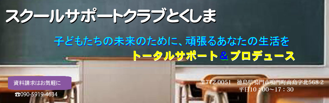 スクールサポートクラブとくしま 徳島県鳴門市鳴門町高島字北568-2 | 資料請求はお気軽に ☎ 090-2893-0388 |